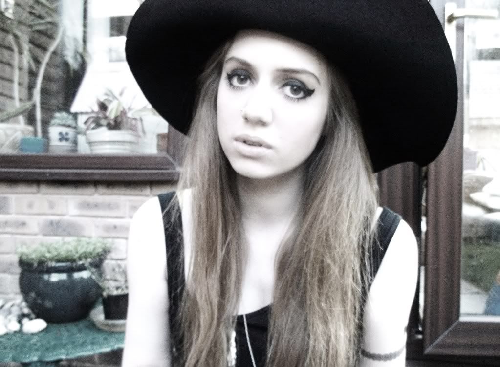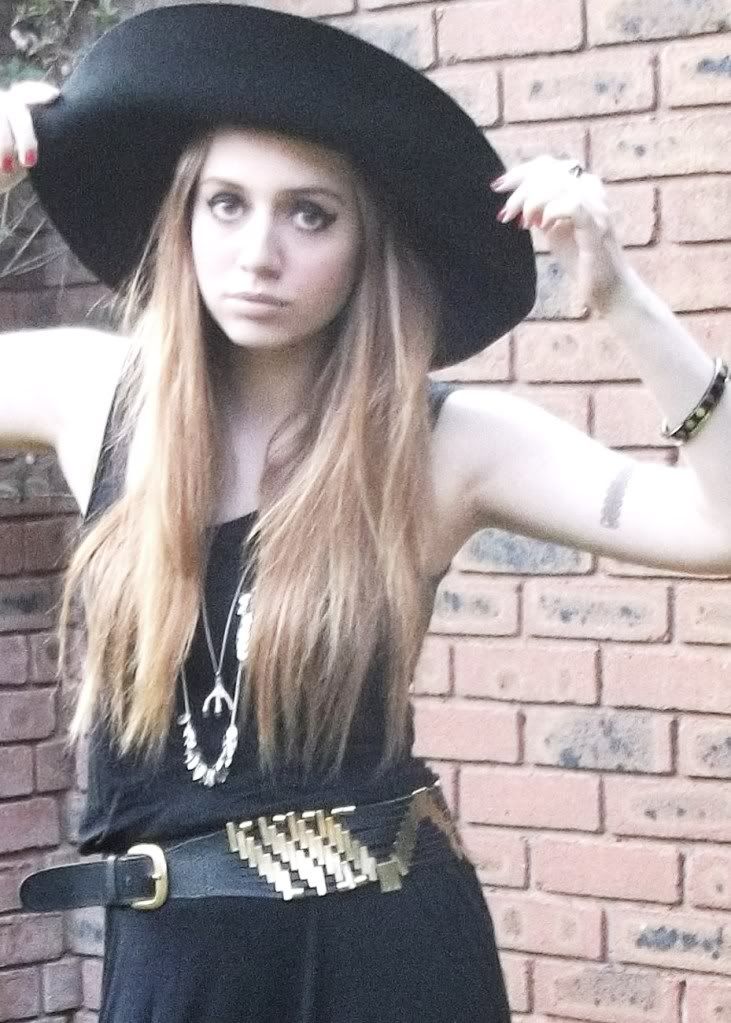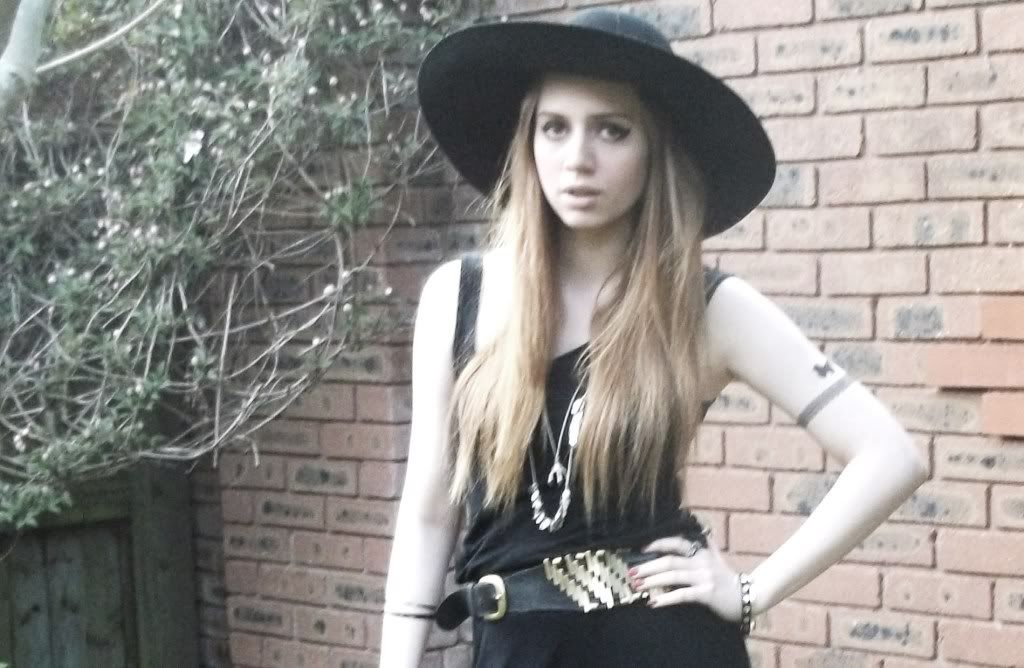 These photos are very grainy, partly because of the weather, the sun seems to have dissapeared again and left grey skies... and partly because my camera keeps bloody running out of batteries, I need to invest in some rechargable ones because I seem to be spending £5 every two days on new batteries. These are my last couple of days of freedom because from Saturday I will be working 8, YES EIGHT, days in a row 9am till 6pm, I will have no free time, I am completely dreading it but the only thing that is positive is I will have enough money to buy some litas & other things. Anyway, about this outfit, I decided to dress up as some kind of 70's woman in the garden, equipped with fake tattoos because I'm too much of a chicken to get a real one. I've also decided to finally grow my fringe out (I've had a fringe all my life) but I'll probably change my mind in a day or two and cut it. I bought this belt from Topshop a couple of years ago after seeing Mary Kate Olsen wearing a Balenciaga belt, then Topshop brought out this lookalike. The shoes are also Topshop, I love them as they're so 70's and they remind me of Studio 54, the heel is amazing, but they're deathly to walk in. Also, excuse my really muscly/fatty looking arms in these photos, got to do something about that. xo